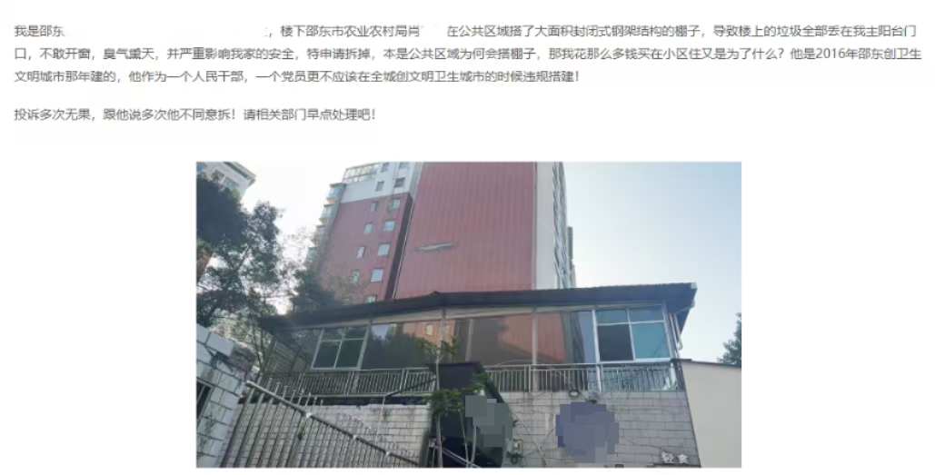 1月16日,湖南省问政平台红网《百姓呼声》一篇投诉举报内容引发关注。邵东市宋家塘街道某小区业主发帖投诉,市农业农村局负责人肖某某在公共区域,大面积违章搭建,“楼上的垃圾全部丢在我主阳台门口,不敢开窗,臭气熏天,并严重影响我家的安全,特申请拆掉”。该业主还表示,该违章建筑早在2016年就已经搭建。