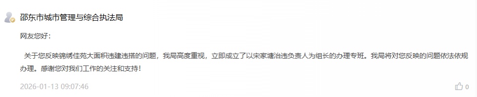 1月13日,邵东市城市管理与综合执法局回复该网民:关于您反映锦绣佳苑大面积违建违搭的问题,我局高度重视,立即成立了以宋家塘治违负责人为组长的办理专班。我局将对您反映的问题依法依规办理。